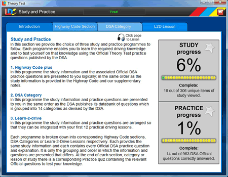 • Theory TestContains the entire Official DSA Theory Test question bank for car drivers and motorcyclists with new case studies and Abridged Theory Test all with click on text professional voice over.